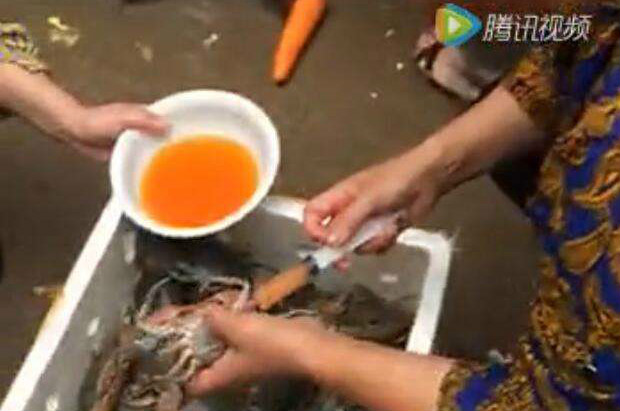 真相:有网传视频显示,一位大妈手持注射器向青蟹注射不明液体,网民纷纷猜测注射物为胡萝卜素、黄粉、蟹黄膏和尿素精等。业内多名专家证实,如此打针,青蟹很容易死。注入异物后,蟹的口感也会变得不一样,马上就会变味,商家不会这么做。